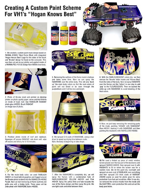 FASKOAT is mixed with FASGLITTER for a sparkling metallic finish. Add 1 vial of FASGLITTER to 1 bottle of FASKOAT (or 1/4 to 1/4 combination, etc.). When painting a clear body from the inside - spray your glitter mixture to evenly cover the surface until you get the metallic look you like. Back it with color of your choice. FASKOAT can also be used to seal FASKOLOR paint from water or nitro fuel for clear bodies - just spray on as your last coat(s). FASKOAT is an excellent medium for gluing magazine pictures, photos, etc. to the inside of a clear body for body. Just cut out your image, brush FASKOAT to the front (thick coverage is best), position where you want on body and lightly wipe of overage. Let tack up for 5-10 minutes and your ready to cover with color. This process leaves an almost seamless finish depending on your colors. It is flexible, water based and non-toxic.