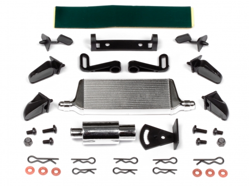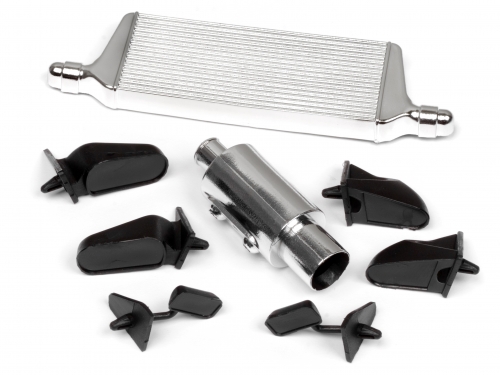Add some bling to make your car stand out from the crowd with the realistic HPI Body Tuner Kit. You get a large diameter custom chrome exhaust, a detailed front intercooler, and 3 different kinds of side view mirrors. The radiator and exhaust include molded nylon mounts that keep them firmly attached to your bodyshelland allow you to adjust the location and angle. Bolt on your choice of 3 different side mirror styles and you're ready for action!