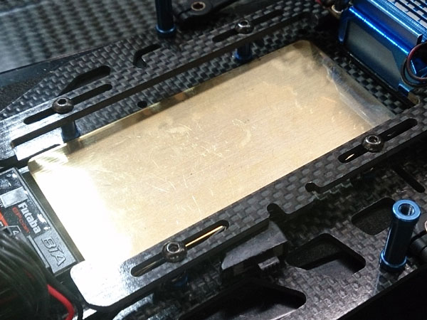 厚さ1mmの真鍮製ウエイトです。サイズは46.5×137mmで2SサイズのLi-Poバッテリーにジャストフィットします。重さは53gです。軽量なLi-Po、Li-Feバッテリー使用時のウエイト調整に最適です。低重心で安定性向上も期待できます。超ハイグリップ路面でもハイサイド対策にも有効です。