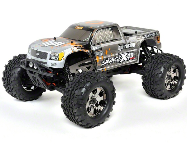 The Savage X 4.6 features the fantastic GT-3 truck body in Silver/Black. The GT-3 body comes completely trimmed, decaled and mounted for the ultimate in ease. The intricate paint designs feature an action sports inspired layout for concours quality appearance. And you can always customize your truck with any of the clear or pre-painted polycarbonate body shells from the huge assortment of HPI bodies and other manufacturers as well! For great looks, the Savage X 4.6 is topped off with a clean set of black chrome Warlock wheels, a grey anodized engine head, and orange anodized aluminum parts