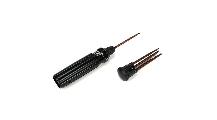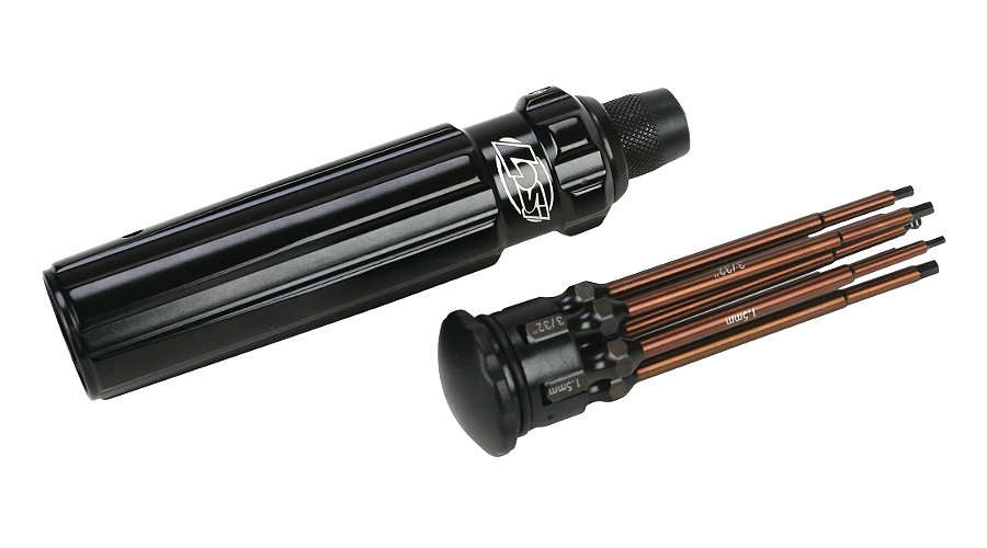 This 8-in-1 tool set includes an anodized storage handle with seven different hex sizes (.050 in, 1/16 in, 1.5 mm, 5/64 in / 2.0 mm, 3/32 in, 3/32 in Ball End and 2.5 mm). Tips lock in place unlike other tools using magnets that may slip.