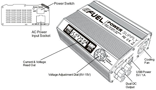 Your eFUEL switching DC Power Supply is designed to use household AC power source to power equipments that required DC power. The eFUEL converts standard household power 100-240V AC to 8-15V DC power and can supply up to 20 amperes of continuous power.