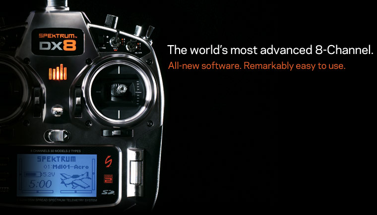 The DX8's powerful Spektrum AirWare software was developed exclusively by Spektrum from the ground up. This software includes all the programming functions an expert pilot could want, but you don't have to be an expert to use them. The DX8's intuitive Simple Scroll™ interface lets you "roll and click" your way between menus with ease. And all the information is presented in crisp, clear detail on a big, backlit LCD screen.