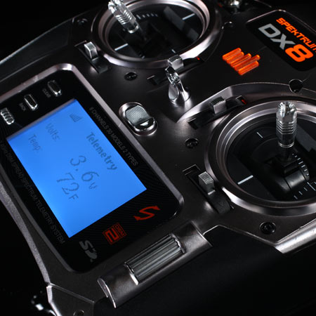 he DX8's built-in telemetry feature (Telemetry Module Sold Separately) gives you vital, real-time information about what's happening with your model in flight; information that can prevent crashes and maximize performance. The telemetry data appears in an easy-to-read format on the large backlit LCD screen so you can reference it at a glance. You can also have the DX8 alert you with an audio or vibe alarm whenever any telemetry values exceed limits you define. The DX8 will initially be able to track four key safety and performance factors: