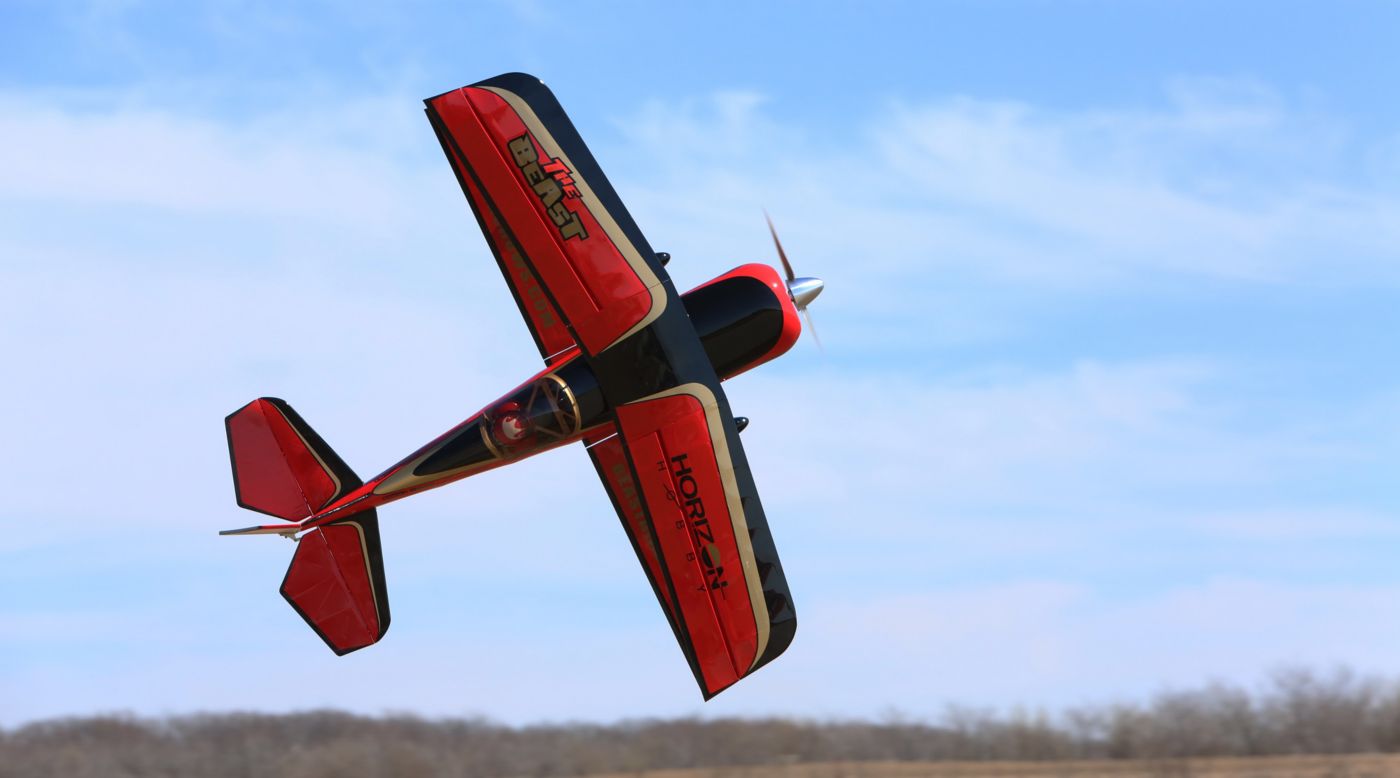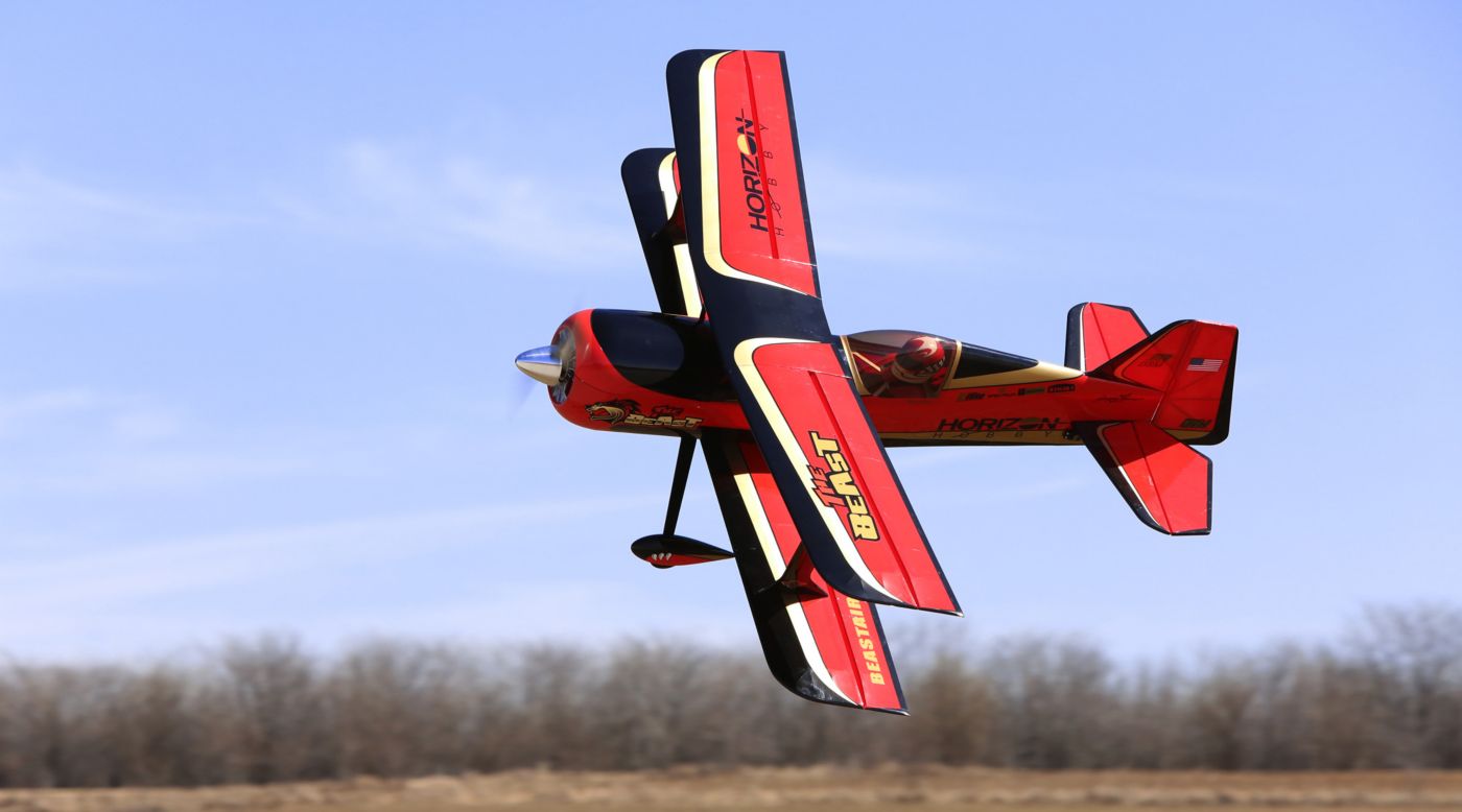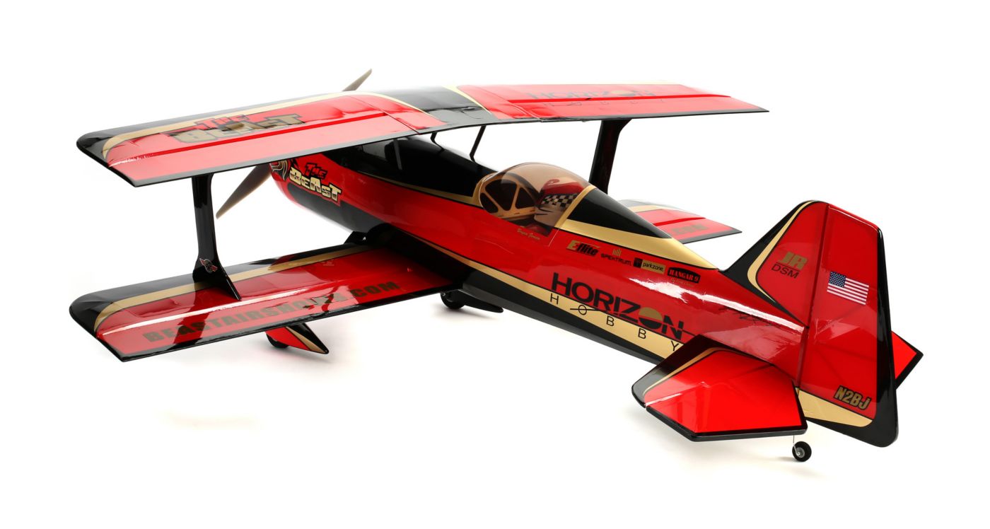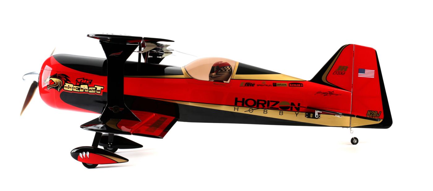 The E-flite® Beast 60e ARF biplane embodies everything you'd expect from a design created to deliver stunning feats of aerobatic artistry. The full-scale Beast is the brainchild of renowned aircraft restoration expert, Kevin Kimball, who actually collaborated with 3D champ Quique Somenzini on its design. Its dramatic ability to flip, roll and tumble with formidable precision inspired the 100cc Hangar 9® Beast that's widely recognized as a modern classic. For this inaugural 60-sized iteration, the E-flite development team worked closely with Quique to ensure the impressive performance and feel of a larger aircraft came through. Because it's been designed specifically with the modern electric pilot in mind, every design element takes full advantage of what potent electric power has to offer including engineered construction that's feather-light. As a result, the Beast 60e is a whole new breed of animal.