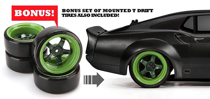 • Two complete sets of custom green wheels with one set of drift tyres and one set of grip tyres