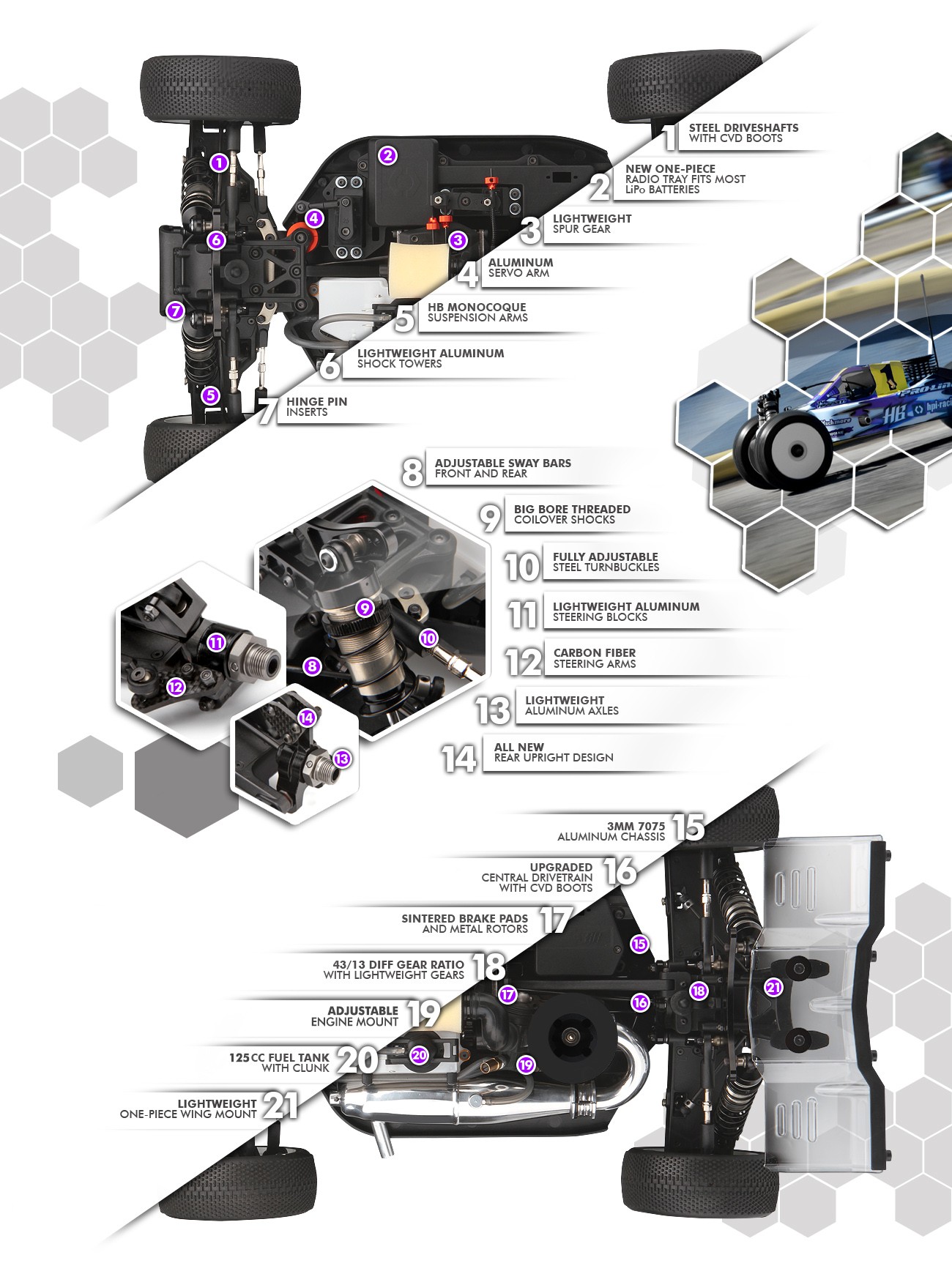 • Tuning options include: steering blocks, arm blocks, steering arms, rear hub carrier arms, sway bars, shock springs and more