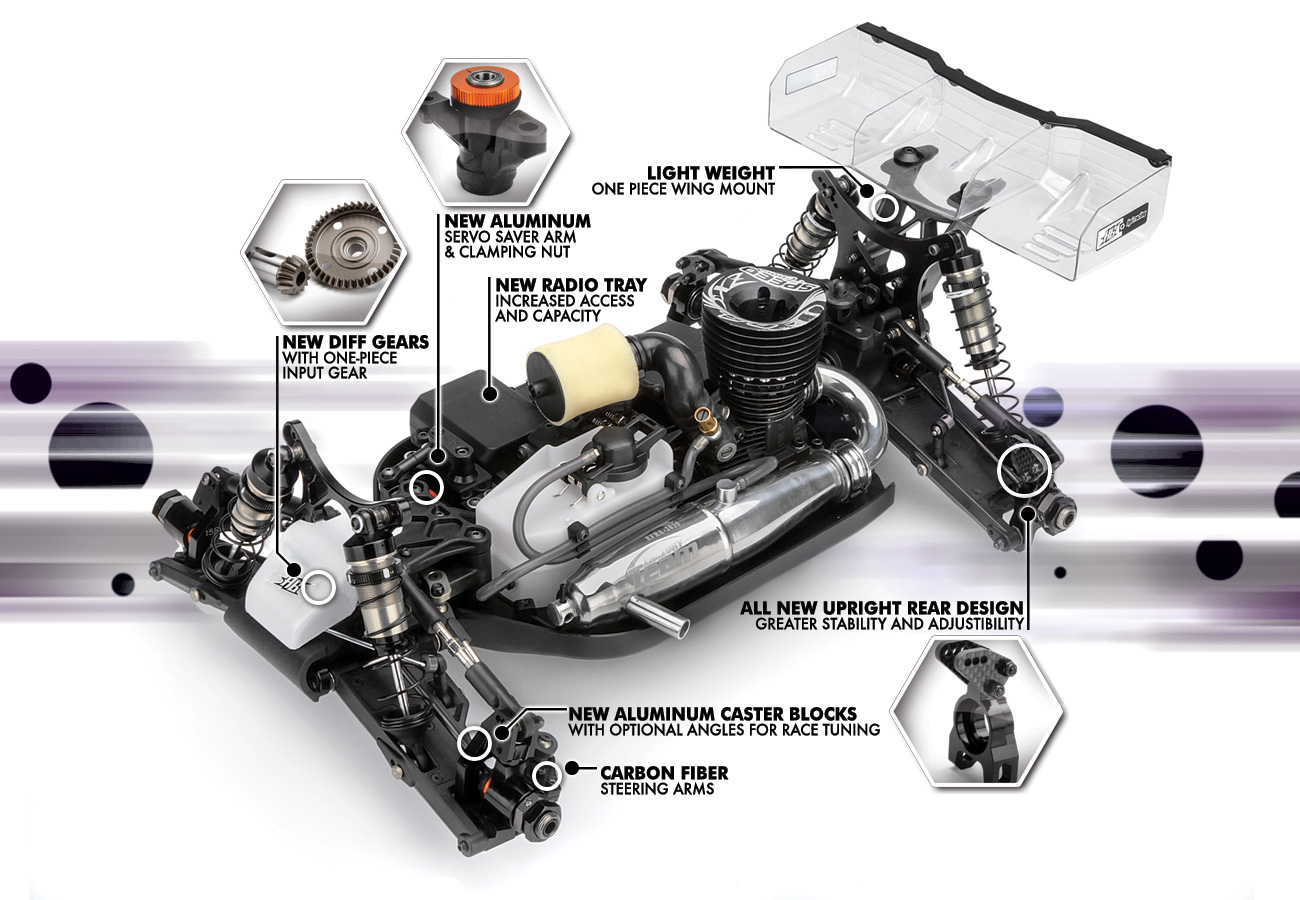 • Requires engine, tune pipe, radio, receiver, 2 servos, receiver battery, paint, tires, CA glue, wheels