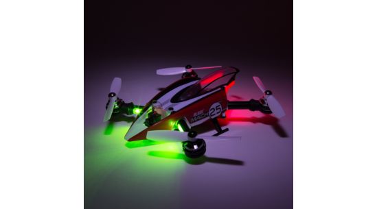 The Blade® Mach 25™ multirotor makes getting into 250-class quad-racing easy. Thick carbon-fiber plate construction with robust aluminum support makes this fully assembled racer lightweight and incredibly durable. In the event of a mishap, replacement of the self-tightening propellers is all you’ll likely need. Brilliant LED lighting helps with orientation and identification in the heat of a race. Powerful motors that are canted forward help give you the performance edge while the protected ultra micro FPV camera is soft mounted for the best view. The streamlined body combines improved aerodynamics with an additional level of protection that makes your Mach 25 machine stand out from the pack.