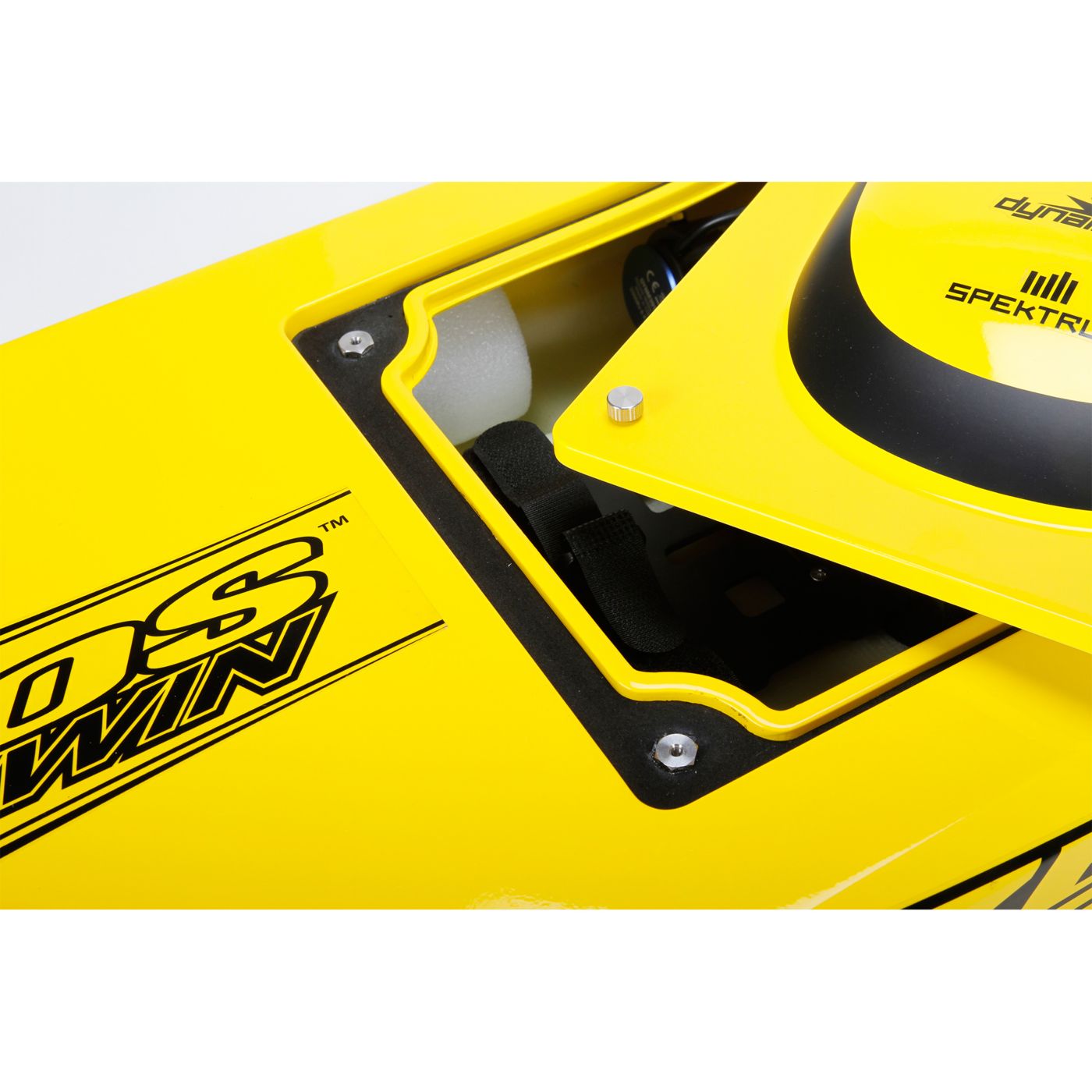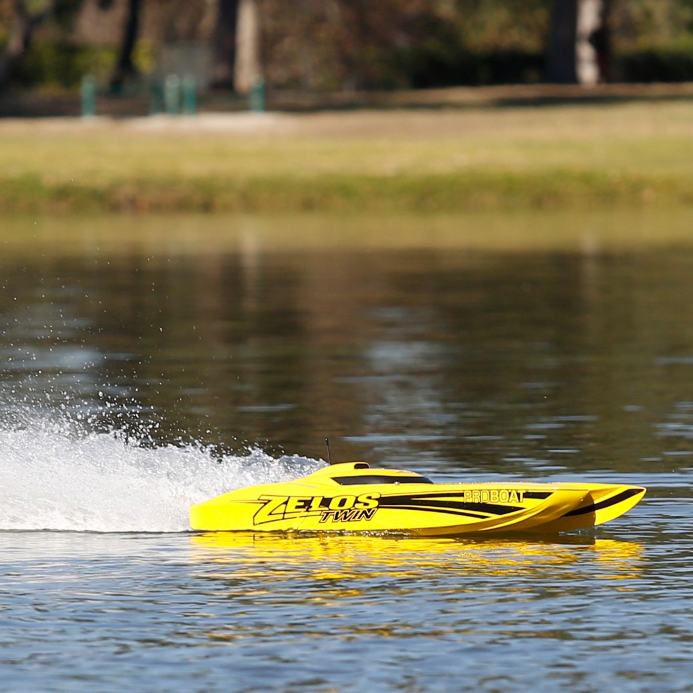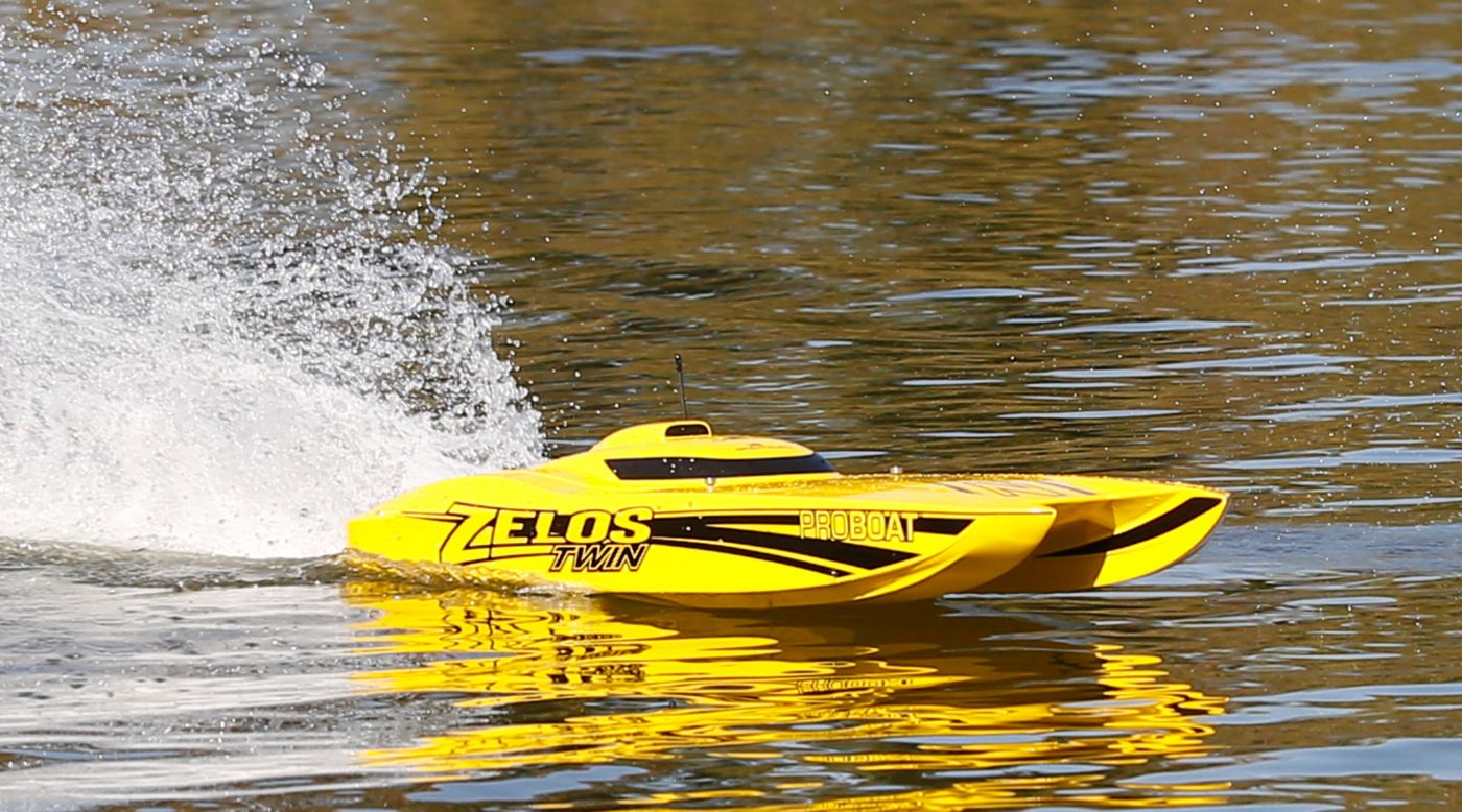 The Pro Boat® Zelos™ 36 Twin catamaran comes ready to deliver a double dose of speed. Featuring twin 6-pole, 2000Kv brushless motors, this 36-inch catamaran is capable of reaching pulse-pounding speeds in excess of 60mph.