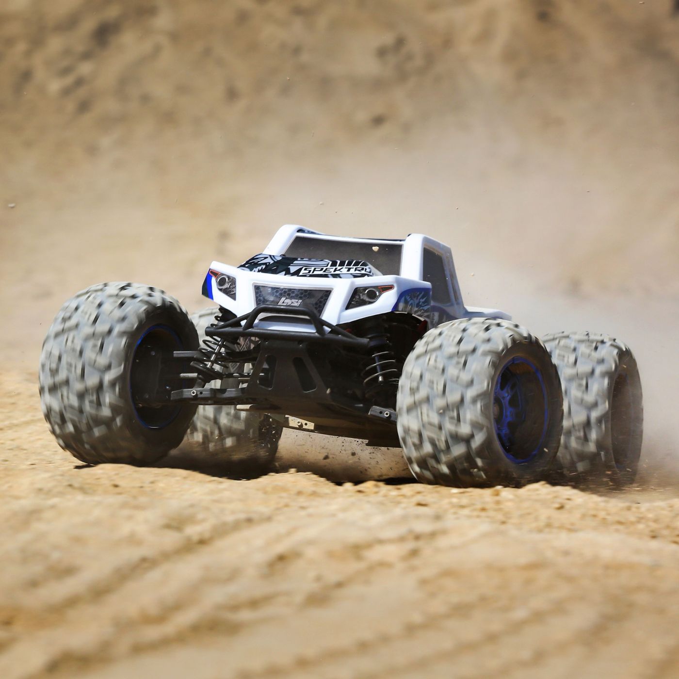 Unlike most monster trucks, the 3XL-E uses a center differential that ensures a proportional delivery of power to all parts of the vehicle, regardless of conditions. It lets the truck accelerate and stay balanced on any terrain.