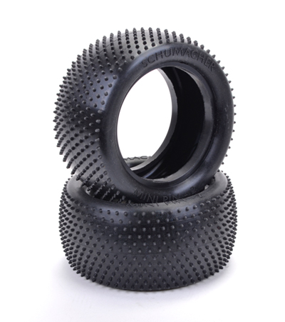The Mini Pin 2 rear tyre, this is a tyre for high grip astro and carpet racing. The new tyre has a thinner wall thickness which is aimed at providing more traction and improved bump handling. The pins have been designed to have more of a radius edge as opposed to the square edge on the previous and hugely popular Mini Pin tyre. This allows the tyre to work perfectly straight from the packet, without the need for bedding in. The Mini Pin 2 is available in Yellow, Silver and hard wearing Blue compound, the Yellow is available pre-glued on the Flexlite 12mm hex wheel.