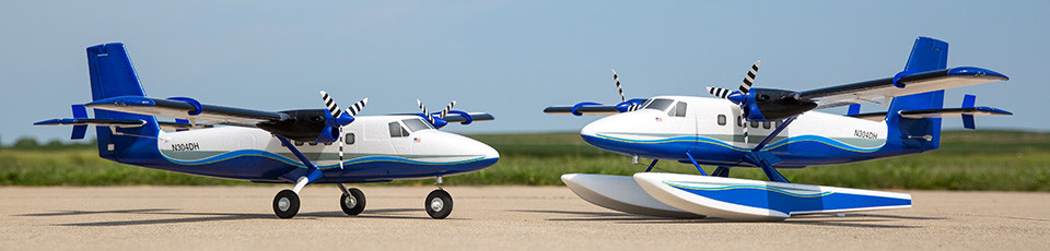 Equipped with tricycle landing gear that includes a steerable nose wheel, the Twin Otter offers excellent ground handling and can be flown from paved, grass or dirt surfaces. You can also fly from water using the included float set — it matches the trim scheme and features a water rudder for superb steering control. Both gear options are easy to install and can be swapped out in minutes.