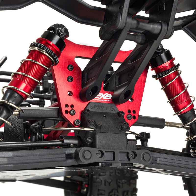 Durable steel driveshafts plus all-metal diff outdrives and gearbox internals keep the heavy-duty 4-wheel drivetrain rolling over punishing tracks. An Extreme Bash toughened suspension system smooths the ride, with a steel rear suspension mount and adjustable oil-filled shocks mounted on 7075 T6 anodized aluminum front and rear shock towers.