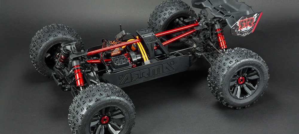 Bigger than big and engineered for brute power and toughness, the ARRMA® 1/5 scale KRATON™ 8S BLX 4WD Speed Monster Truck takes your bashing ability to the next level. Its metal-reinforced design lets you blast up, over, and through bruising obstacles without worry. Metal shafts, turnbuckles and outdrives, plus all-metal internal gears, give the drivetrain and suspension system unstoppable strength. The anodized aluminum chassis plate features composite side pods and a triangular center brace for maximum durability. Ultra-thick composite front and rear shock towers hold massive 20mm bore, oil-filled adjustable shocks that soak-up bumps and jolts.