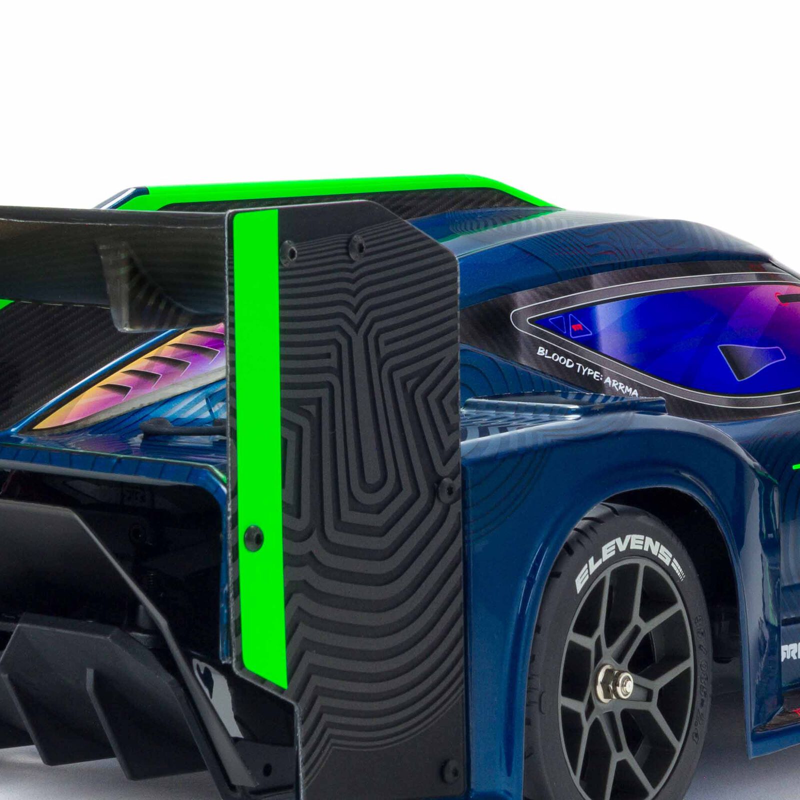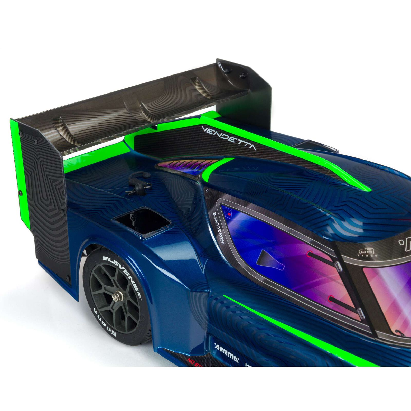 The aerodynamically tuned VENDETTA Speed Racer body includes tough high and low downforce wings. It's available factory-finished in your choice of stunning green or blue matte and gloss effect paint schemes with scale decals.