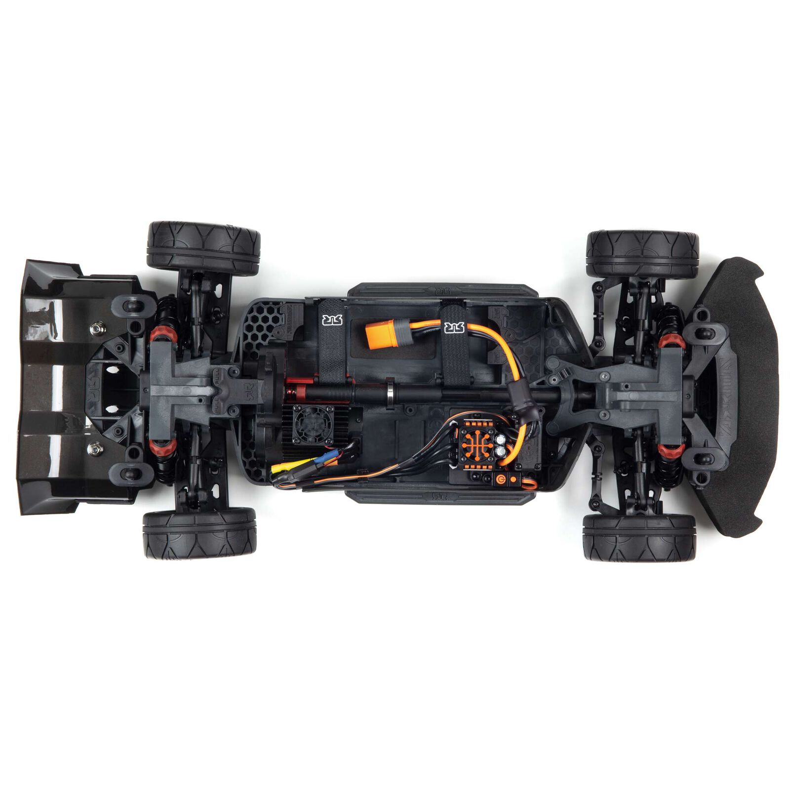 While you're maximizing the speed potential of the powerful Spektrum Firma 3660 3900Kv brushless motor, high and low downforce wings on the aerodynamically tuned body help keep your tires glued to the surface. The dBoots® Hoons Elevens vented all-road tires are mounted on tough, gun-metal colored nylon wheels and deliver incredible traction in all surface conditions, while a large rear double diffuser reduces turbulence and drag.