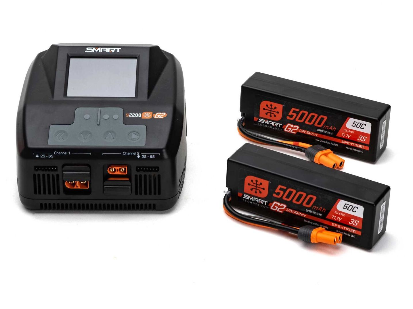The Smart G2 Powerstage bundle is a one-box solution for vehicles requiring top performance. Designed with the simplicity of Smart G2 Technology, this bundle includes (2) 5000mAh 3S 50C Smart G2 LiPo Batteries, and (1) S2200 Smart G2 Dual Port AC Charger.