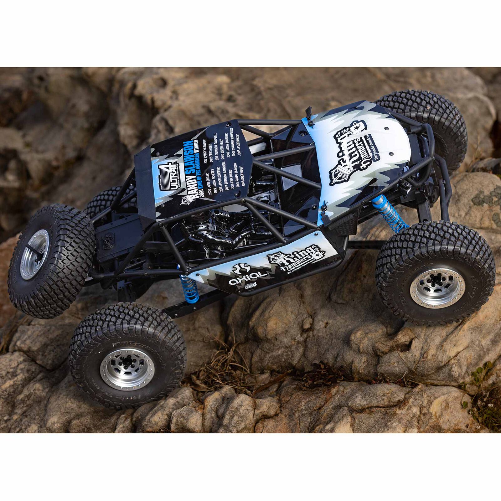 The Axial® RR10™ Bomber Limited Edition King of the Hammers rock racer captures the unique spirit and style of this amazing annual event in livery created especially for this release. One highlight: On the roof Axial® has screen printed the names of all past KOH winners, with an emphasis on Randy Slawson — the reigning 3-time KOH champion and the owner of Bomber Fabrication.
