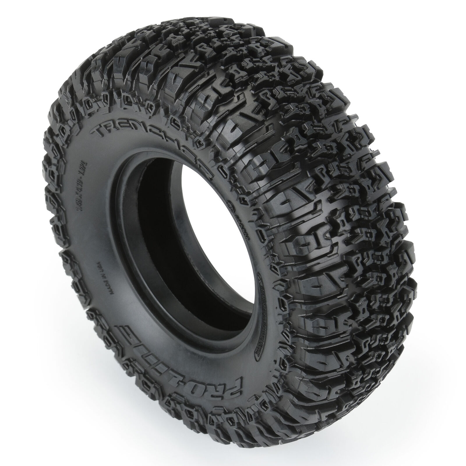 This is a pair of Class 1 Trencher 1.9" Rock Crawling Tires. The future of Class 1 Tire Performance has arrived with Pro-Line's  1.9" (4.19" OD x 1.49" Width) Trencher Tire! Inspired by Pro-Line's insanely popular all-terrain Trencher tread, this tire is ready for anything the terrain might throw at you. It features an extremely aggressive tread pattern with each tread block containing multiple sipes and multiple levels for incredible tread flex while still looking great on a Scale Rig. The highly detailed connected tread on the sidewall of the Trencher extends out for the next level of side-hilling performance that only slides out when you want it to!