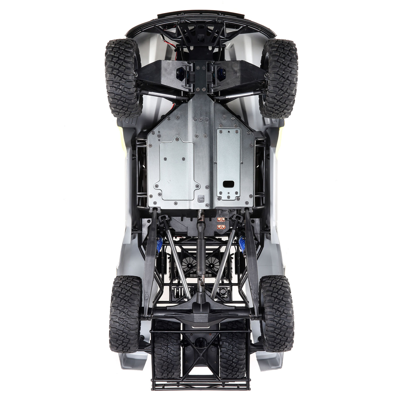 Just like the 1:1 desert trucks, the Super Baja Rey 2.0 comes with a super-rigid roll cage made of super-tough composite material that enhances the truck's scale looks and durability. It is integrated with the 4mm anodized aluminum chassis plate providing the ultimate protection for your truck and electronics.