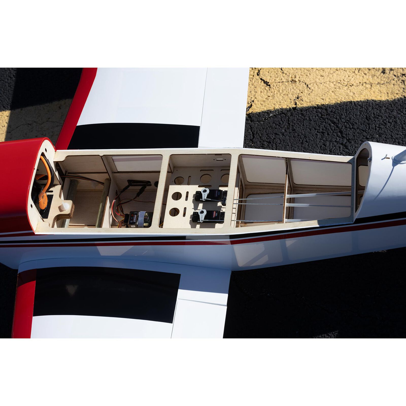 The wing panels feature a strong aluminum tube joiner for ease of transport and storage. When the model is upright, full access inside the model is through a large top hatch that makes any maintenance and battery changes simple.