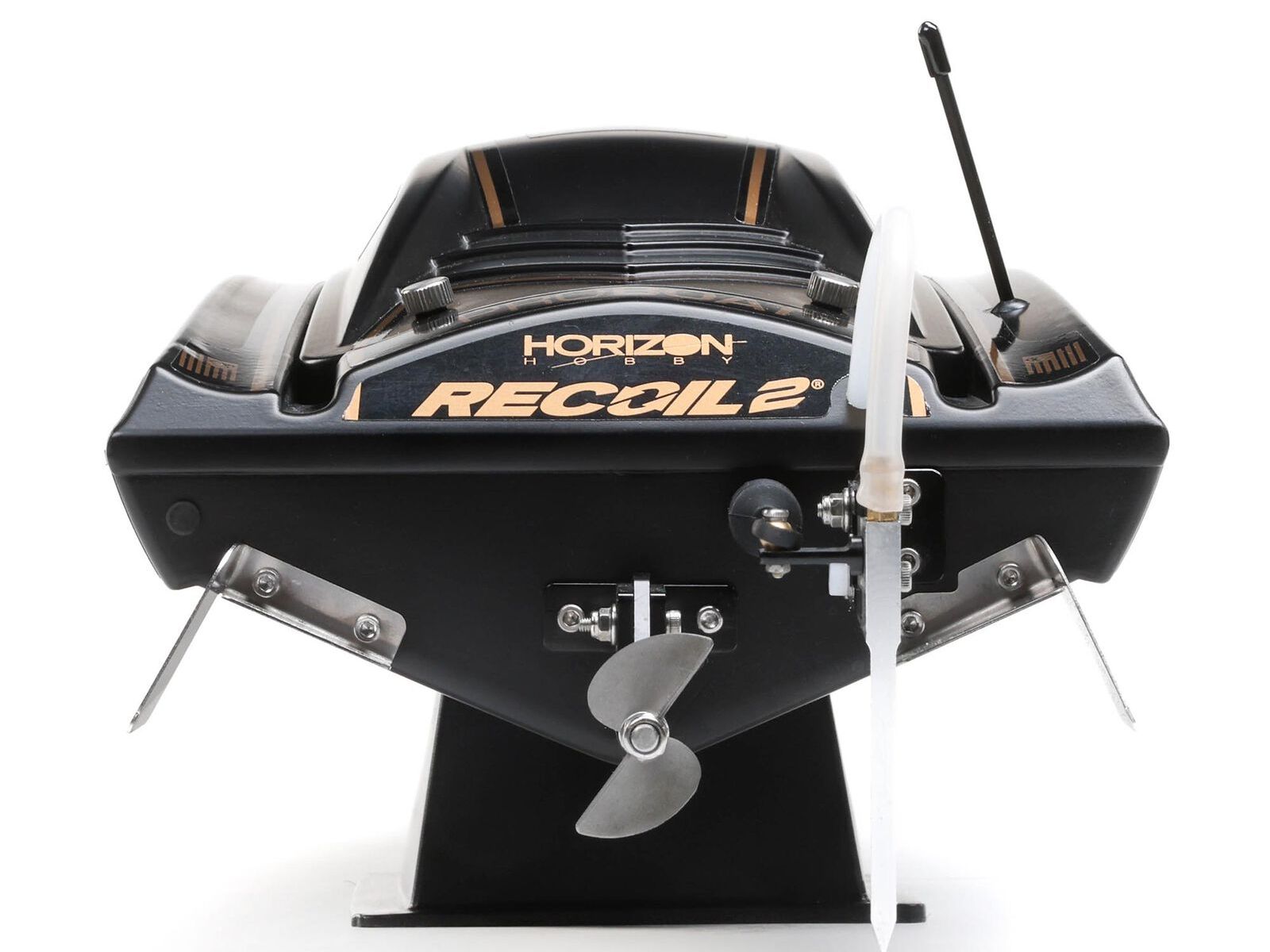 The motor also features an integrated weight on the outrunner, eliminating the need for a weighted coupler to provide self-righting capabilities. No more worries about a wipeout in the middle of the lake. With one press on the self-righting button of the included, custom-programmed Spektrum SLT3 radio transmitter, your deep-V will flip back upright. This design is unique to the Recoil 2 V2. No other boat has it!