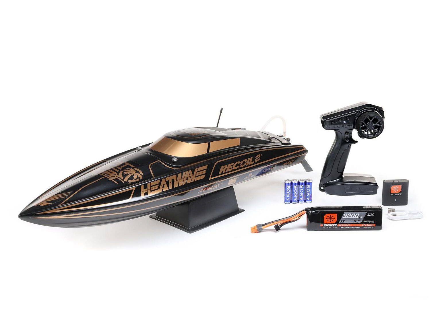 Everything you need is in the box. The Spektrum SLT3 2.4GHz radio system combines standard-setting dependability with the functionality and ergonomics needed to enjoy every moment of your time at the lake. The Smart 3S 3200mAh battery and S120 USB Smart Charger are ideal for newcomers to the hobby. The charger can use any USB port for power, providing a versatile charging solution for every boater. Even a boat stand and AA transmitter batteries are supplied.