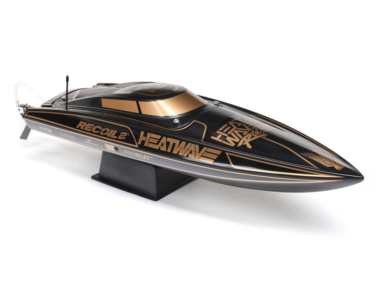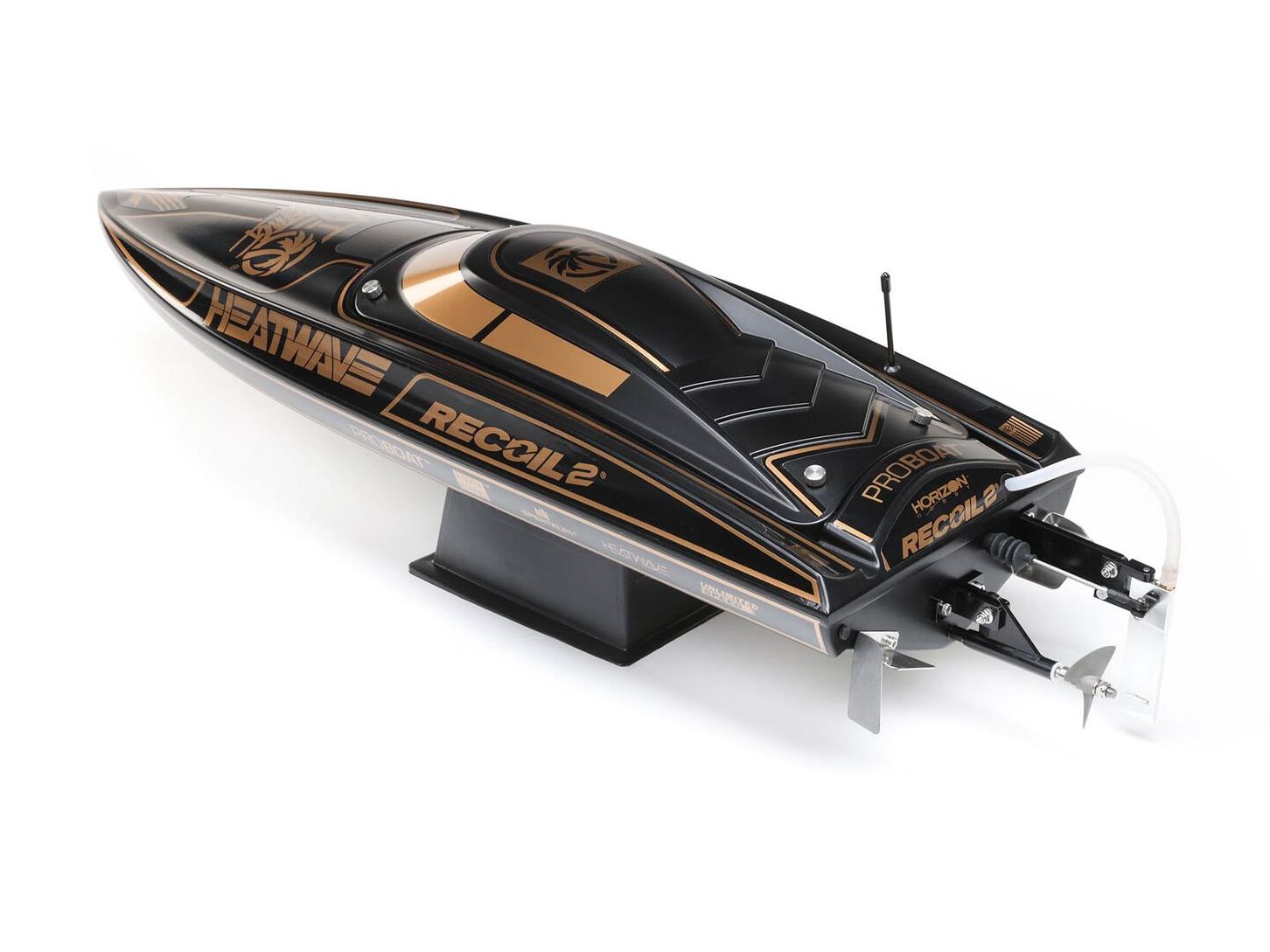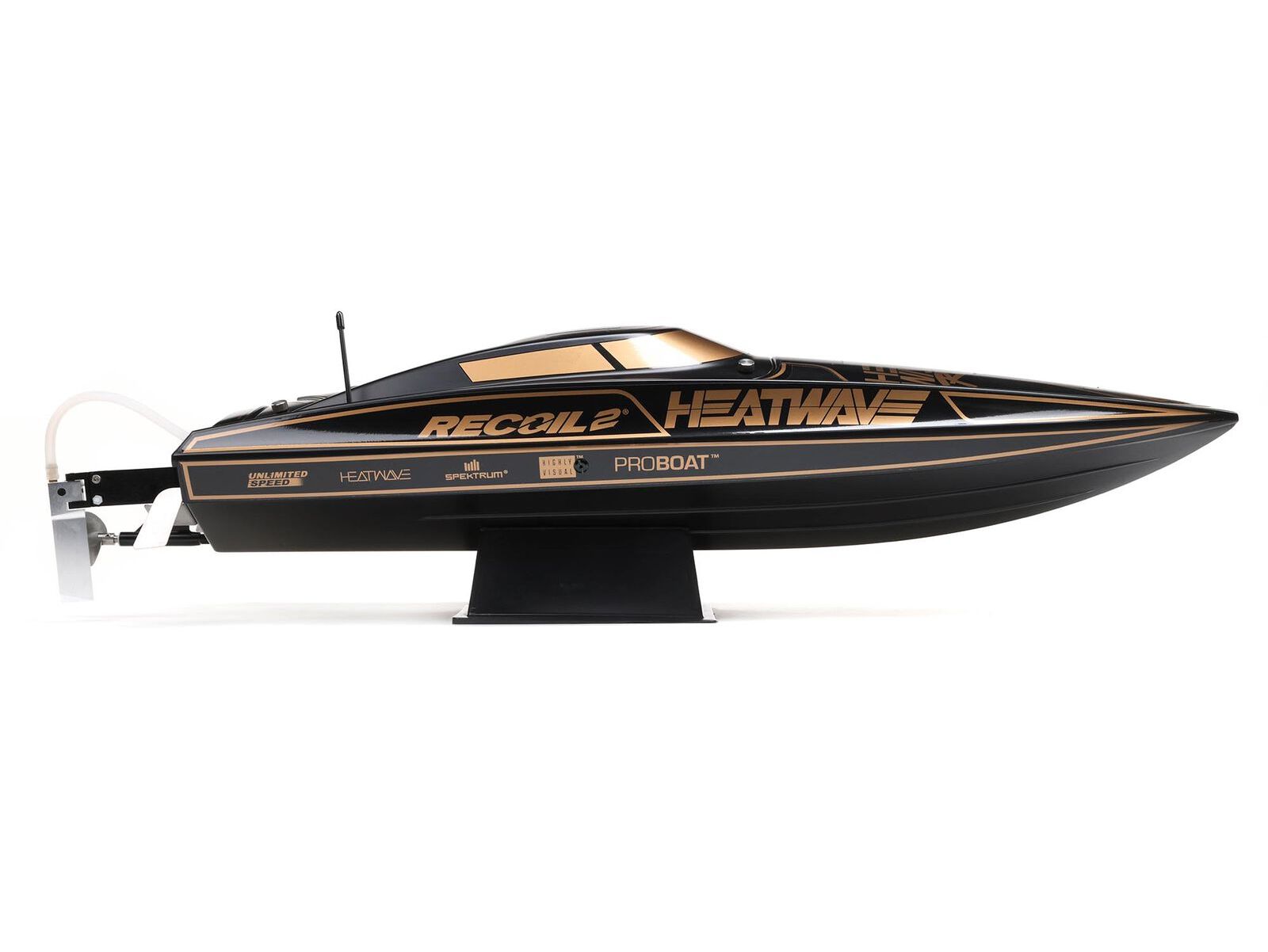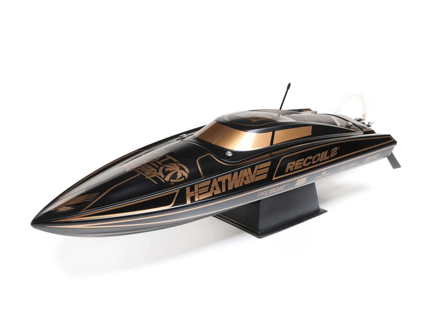 The Recoil 2 V2 also features a strikingly finished, high-impact ABS molded hull and canopy with aluminum thumb screw canopy locks, durable modular interior, and aluminum offset rudder and propeller strut. With its technological advances, ready-to-run simplicity, custom Heat Wave Visual or Shreddy liveries, and worry-free self-righting, the 26-inch Pro Boat Recoil 2 V2 deep-V makes it easier than ever to own the lake!