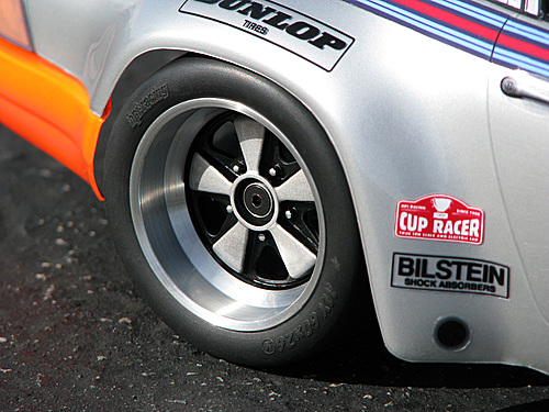 Match the Porsche Carrera RSR body with our replica vintage Porsche wheels for real period authenticity! #3918 WHEELS FOR RC PORSCHE CARRERA RSR (1973) 0mm/2pcs #3928 WHEELS FOR RC PORSCHE CARRERA RSR (1973) 6mm/2pcs To get the awesome dual-colour look on these wheels, brush on semi-gloss black paint, then use a cotton swab or cloth soaked with thinner, acetone or methylated spirit to remove the paint from the rim and outer surface of the spokes. To fully replicate the street version of the Carrera RSR, use two sets of #85527 Body Accessories Set (Chrome) to add the double rear exhaust. The Martini racing version replica uses a single #85529 Body Accessories Set (Black) - note the position of the race car's wipers for authentic looks; the wipers on the street version are reversed. ALSO AVAILABLE: #101320 Porsche 911 Carrera RSR bodyshell without the Body Accessories Set (Black). The decal sheets and window masks are included.