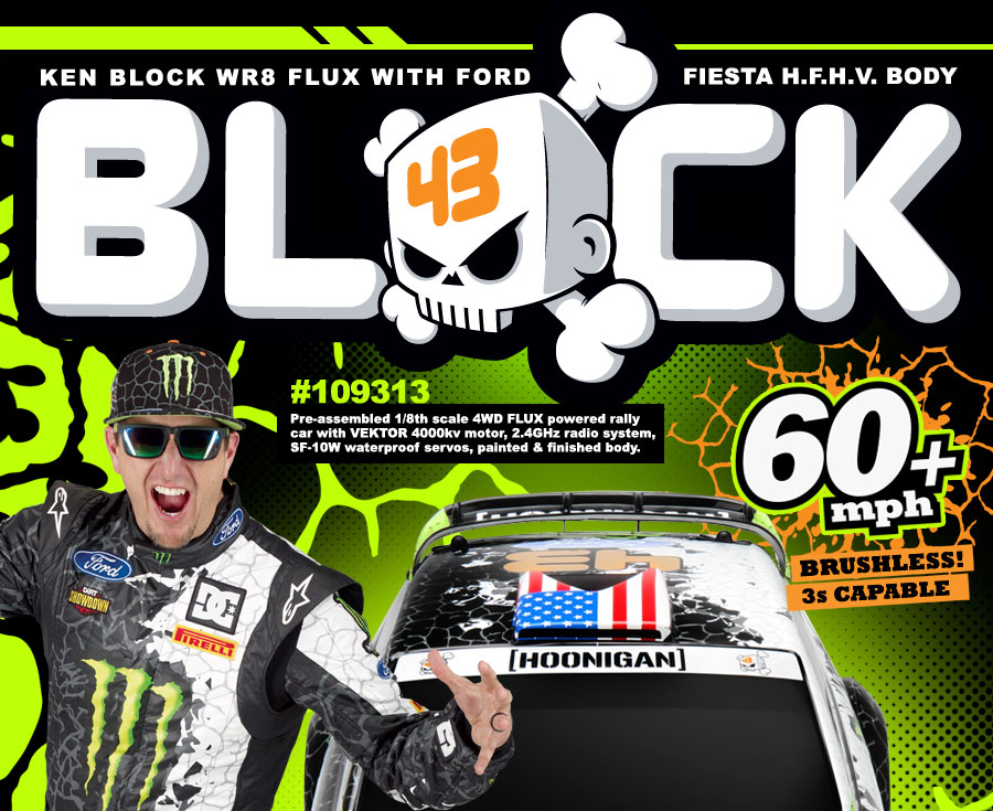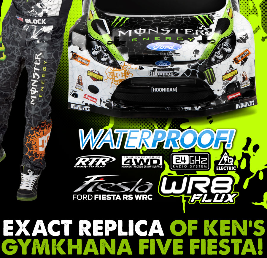 HPI Ken Block WR8 Flux Ford Fiesta 1/8 Scale WRC RTR -  Electric Rally Car with a TF-40 radio system. HPI is proud to introduce the action-packed partnership with famed international super star, Ken Block, and his Gymkhana Five edition Ford Fiesta H.F.H.V.. To kick off this partnership, HPI is releasing an exact scale replica of Ken Block's 650hp Gymkhana Five Ford Fiesta H.F.H.V. which was recently unleashed on the quiet streets of San Francisco in the latest edition of the widely popular Gymkhana video series. The 4WD 1/8th scale RC platform for this asphalt shredding monster is HPI's recently launched WR8 Flux with brushless motor technology, capable of reaching speeds of up to 60 mph! This Ready to Run kit features a highly detailed scale replica Ken Block Gymkhana Five Ford Fiesta H.F.H.V. body, replica tarmac Gymkhana tires and replica fifteen52 Tarmac wheels.