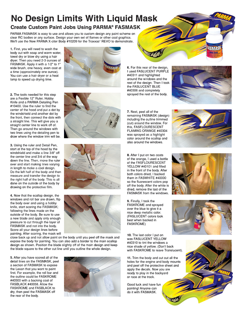 Create your own custom paint designs with our easy-to-use liquid mask. It works great when painting the inside of RC car and truck bodies, slot car bodies, etc. Use a 1/2" wide paint brush or airbrush with large tip to apply a thick even coat. Allow it to dry or use hair type blow dryer to speed up dry time and repeat for a nice "skin", thick enough that it will allow you to cut through with a hobby knife and peel away the sections to paint. It dries clear so you can draw your design on the outside of the body and cut it out in the FASMASK on the inside. Do not cut deep enough to cut the body. You can also use a smaller brush to mask off small, specific areas such as windows, bumpers and graphics. The average RC body requires 2-3 ounces. It can also be used to paint other items like model cars, helmets, etc.