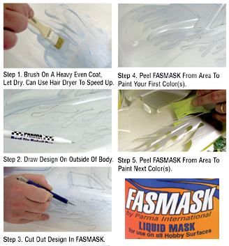 Create your own custom paint designs with our easy-to-use liquid mask. It works great when painting the inside of RC car and truck bodies, slot car bodies, etc. Use a 1/2" wide paint brush or airbrush with large tip to apply a thick even coat. Allow it to dry or use hair type blow dryer to speed up dry time and repeat for a nice "skin", thick enough that it will allow you to cut through with a hobby knife and peel away the sections to paint. It dries clear so you can draw your design on the outside of the body and cut it out in the FASMASK on the inside. Do not cut deep enough to cut the body. You can also use a smaller brush to mask off small, specific areas such as windows, bumpers and graphics. The average RC body requires 2-3 ounces. It can also be used to paint other items like model cars, helmets, etc.